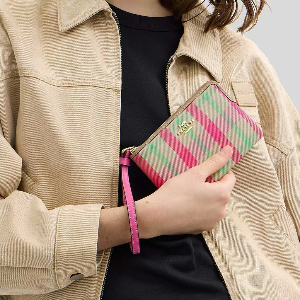 COACH Corner Zip Wristlet With Plaid Print Pink Multi CBP18