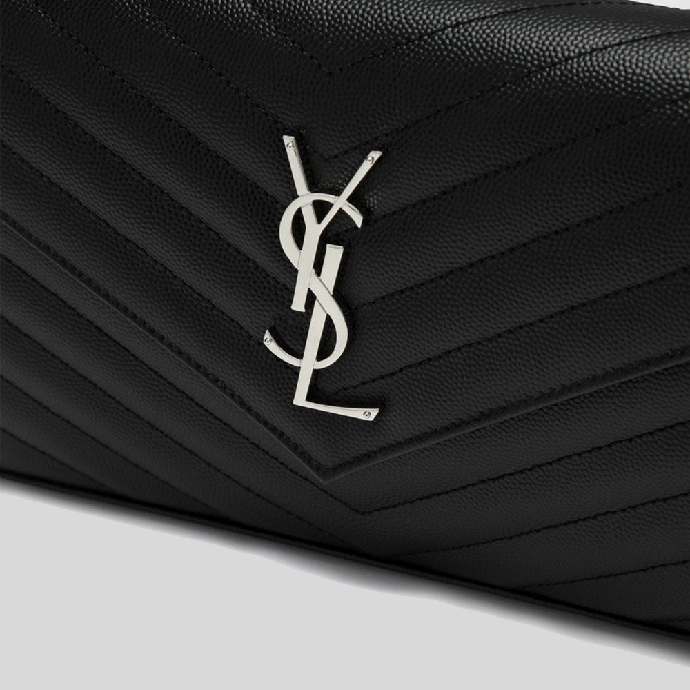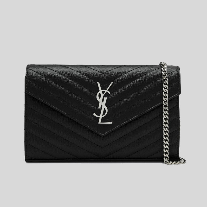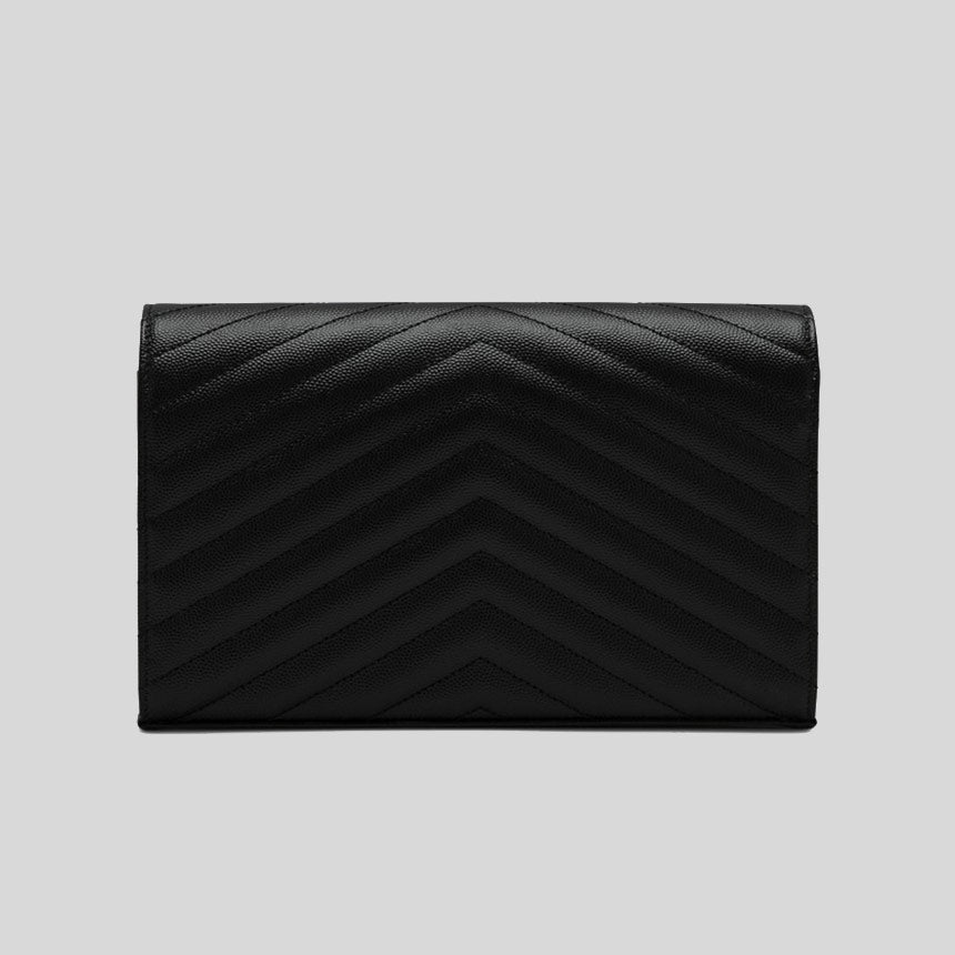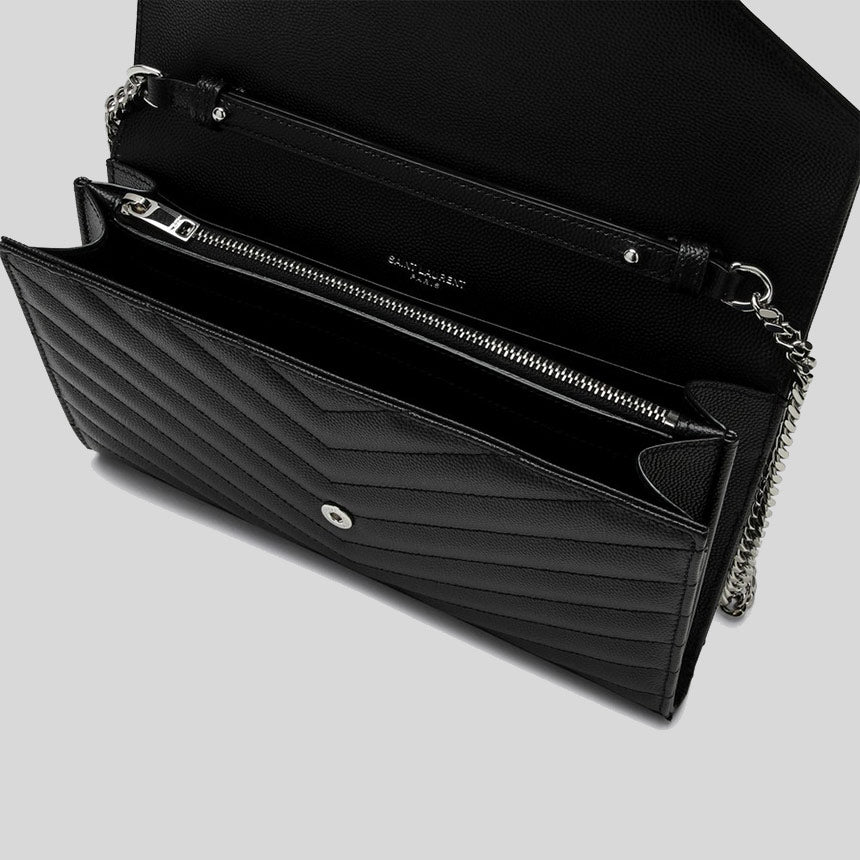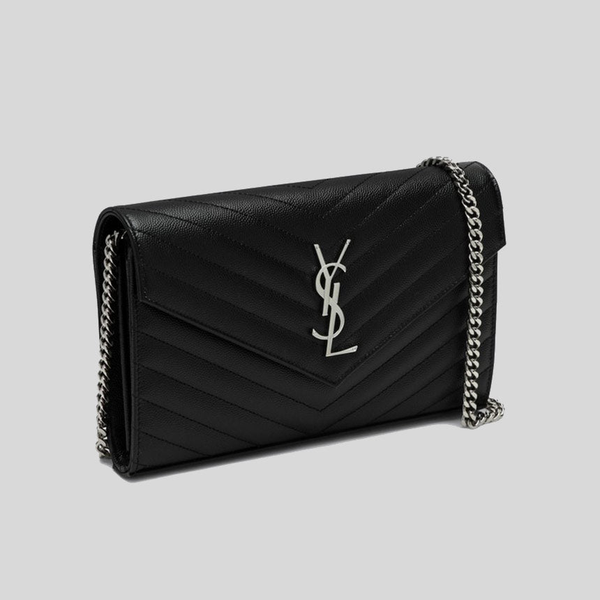 SAINT LAURENT YSL Matelasse Chain Wallet In Grain De Poudre Embossed Leather Black/Silver 377828BOW02