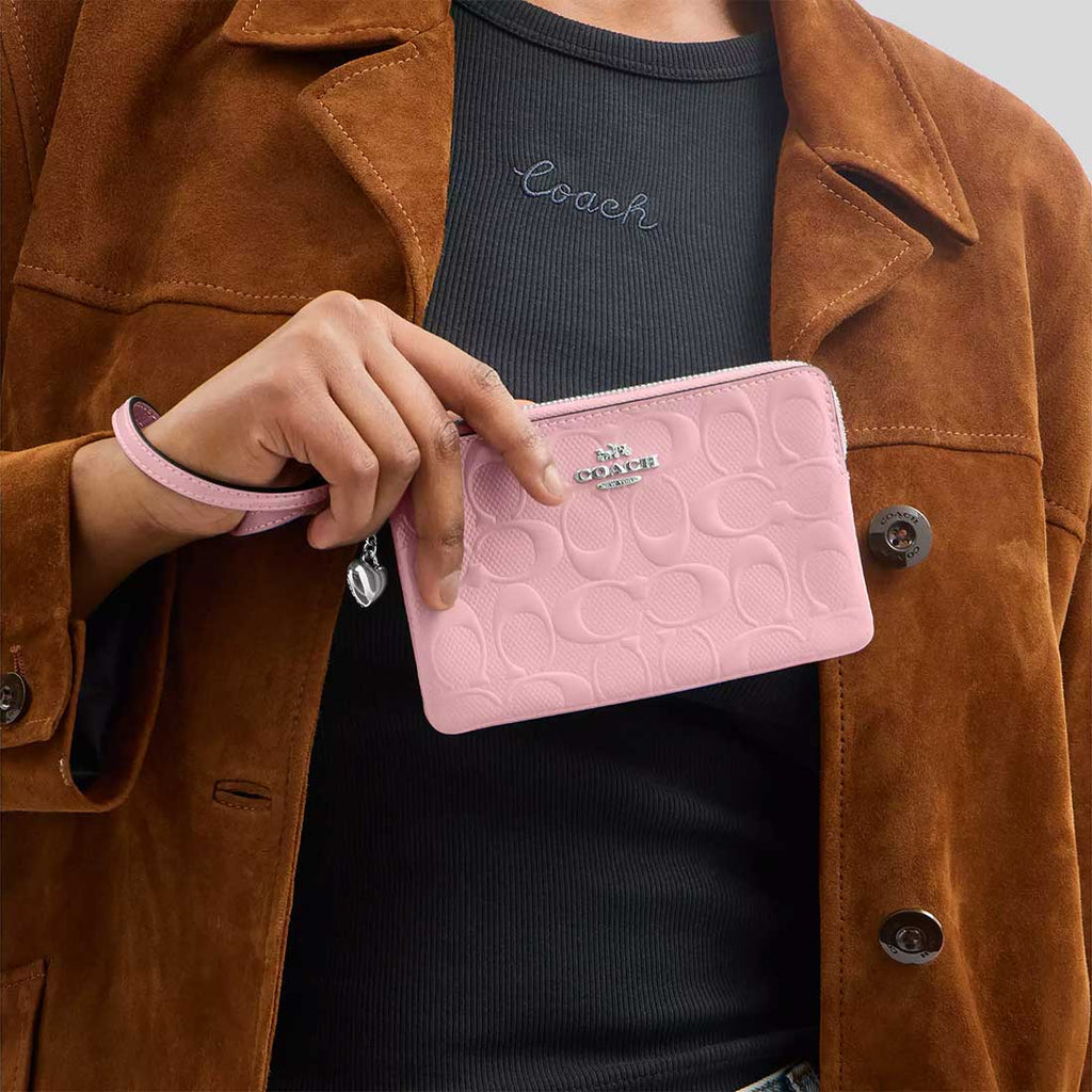 COACH Corner Zip Wristlet In Signature Leather With Heart Charm Silver/Pink CDF04
